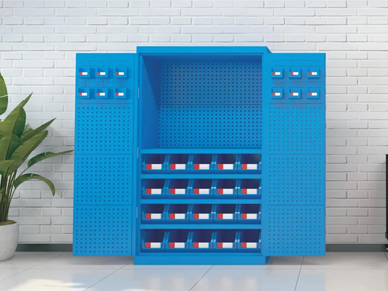 Integrates three storage units: perforated pegboards, multi-sized colored storage boxes, and closed cabinet doors. Pegboards are for hanging hand tools, storage boxes are for smaller parts, and cabinet doors accommodate larger tools/spare materials, achieving precise organization of different items.